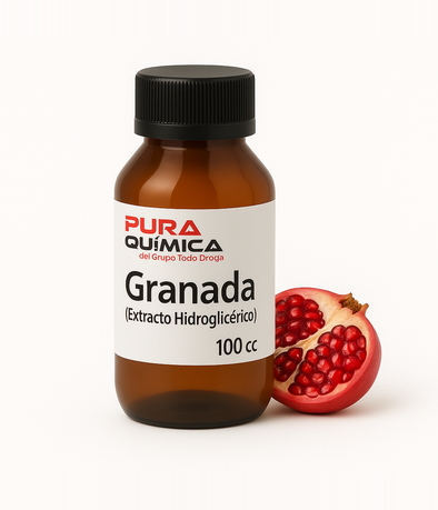 Nombre INCI: Punica granatum extract CAS: 84961-57-9 Liquido rosado Aroma: Frutal caracteristico pH: 3,40 Densidad: 1,10 kg/m3 Base de extraccion: Glicerina vegetal y agua Solubilidad: Soluble en agua y mezclas hidro-glicolicas Uso cosmetico exclusivamente topico Origen y caracteristicas El extracto glicerico de granada se obtiene a partir del fruto maduro de la Punica granatum, rico en polifenoles, flavonoides y antioxidantes naturales como acido elagico y punicalaginas. Se lo valora en cosmetica por su accion antioxidante, revitalizante y protectora celular, ideal para productos antiage, reafirmantes y para pieles desvitalizadas. Cuidado facial y corporal: Cremas hidratantes y antioxidantes Serums antiedad Lociones tonificantes Cremas para piel sensible o fatigada Productos para despues del sol (post-solar) Capilar: Shampoos y acondicionadores fortificantes Tratamientos para cuero cabelludo seco o con tendencia a irritacion Serums capilares antioxidantes Cosmetica natural y vegana: Compatible con formulaciones “clean”, naturales, sin alcohol Utilizado como activo vegetal en productos organicos o artesanales Dosis recomendada y Concentracion sugerida: 1% a 10% del total de la formula, segun el tipo de producto y objetivo cosmetico Para productos faciales: 2%-5% Para productos corporales o capilares: hasta 10% Apto para incluir en fase acuosa a temperatura ambiente o hasta 40 grados C No necesita neutralizacion Observaciones importantes Agitar antes de usar, ya que puede presentar turbidez o precipitado natural por su origen vegetal (sin que afecte la calidad). Conservar en envase cerrado, en lugar fresco, seco y sin exposicion solar directa. No es comestible. Uso exclusivamente cosmetico.